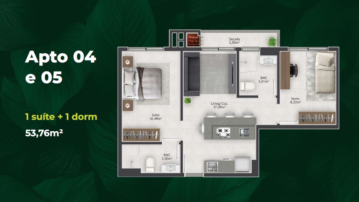 Com 53,76m², essa planta oferece o equilíbrio ideal entre conforto e funcionalidade.