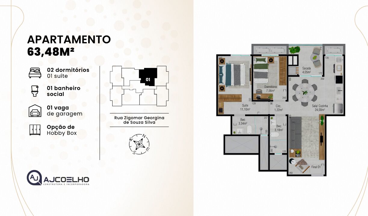 - Diferenciais: Amplo espaço interno com 2 dormitórios, sendo 1 suíte. Conta ainda com 1 banheiro social, 1 vaga de garagem e a opção de hobby box para maior organização e praticidade. Ideal para quem busca funcionalidade e conforto.