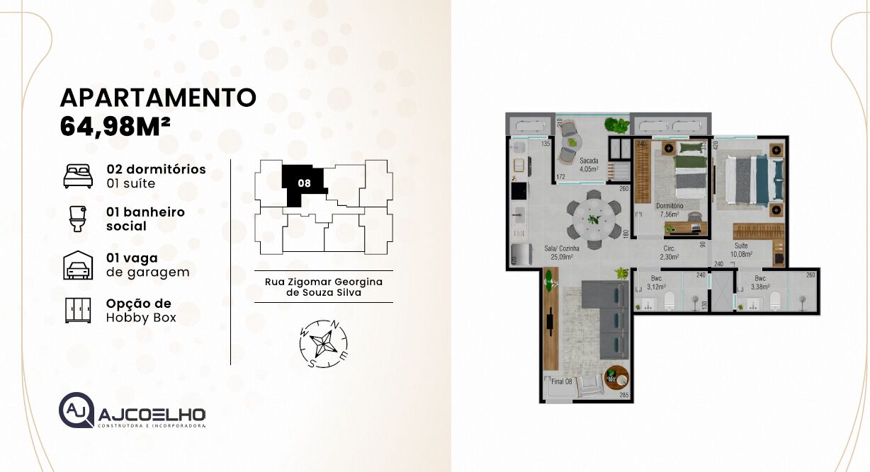 - Diferenciais: A maior planta do empreendimento, oferecendo mais conforto com 2 dormitórios, sendo 1 suíte, além de 1 banheiro social e 1 vaga de garagem. Conta com a possibilidade de hobby box, sendo ideal para famílias que precisam de mais espaço.
