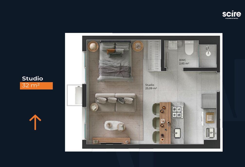 Este studio de 32m² é a opção perfeita para quem busca praticidade e funcionalidade em um só ambiente.