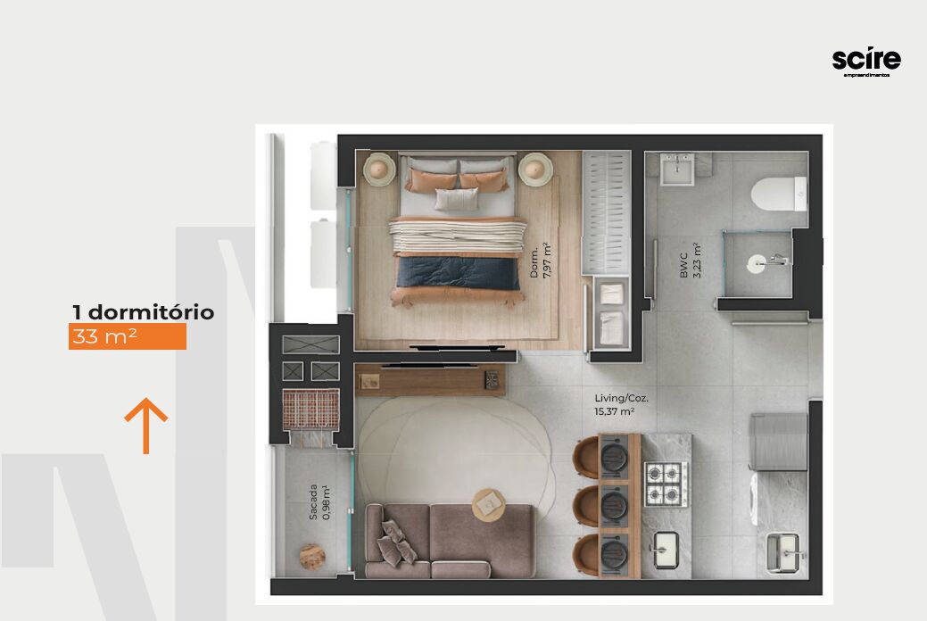O apartamento de 1 dormitório com 33m² é a solução ideal para quem procura conforto e praticidade em um ambiente compacto.
