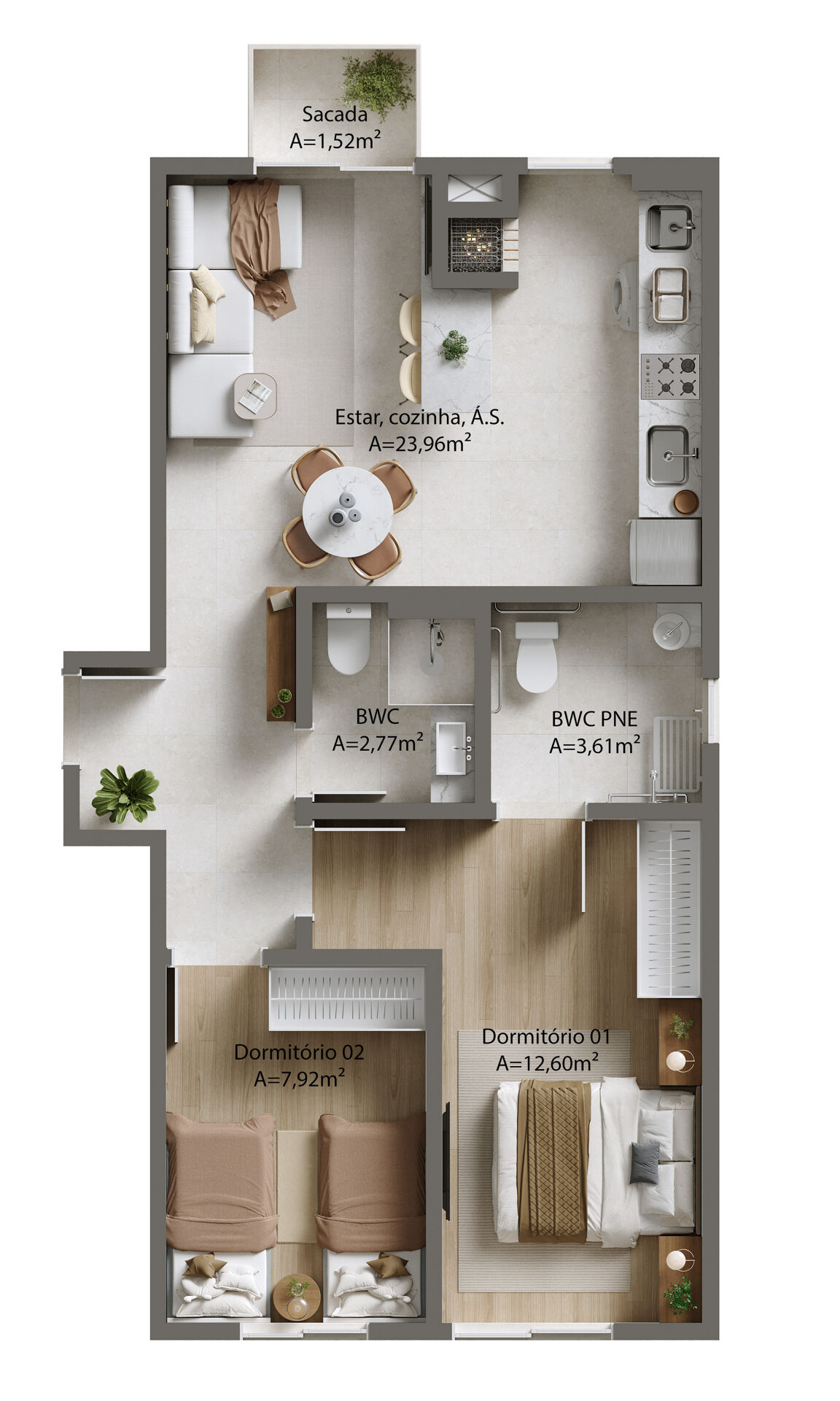 Ideal para casais, famílias pequenas e investidores que buscam rentabilidade, o empreendimento oferece apartamentos com espaços inteligentes e modernos.