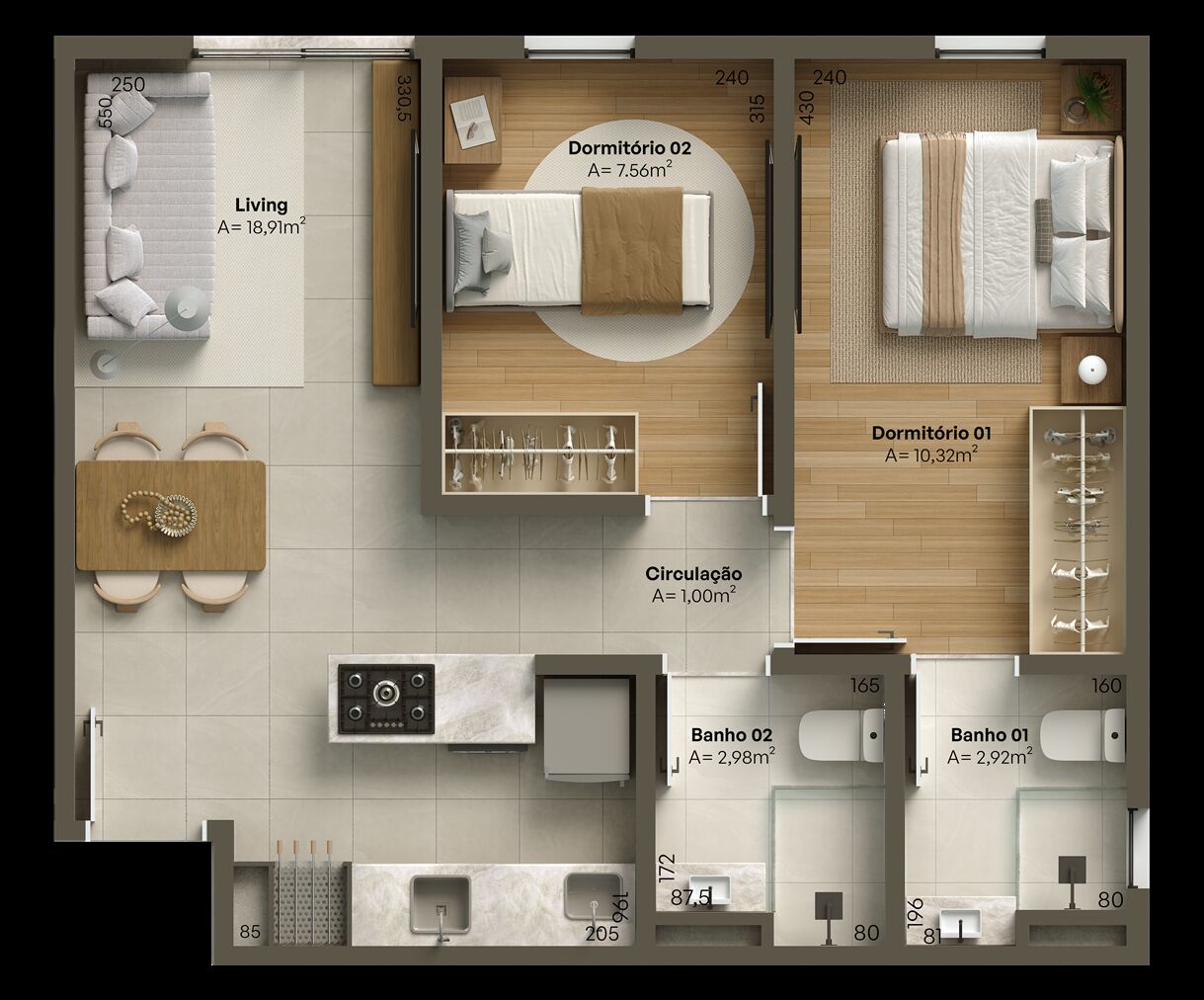 Com 2 dormitórios, sendo 1 suíte, o apartamento oferece uma distribuição inteligente dos ambientes, garantindo privacidade na área íntima e integração na área social.