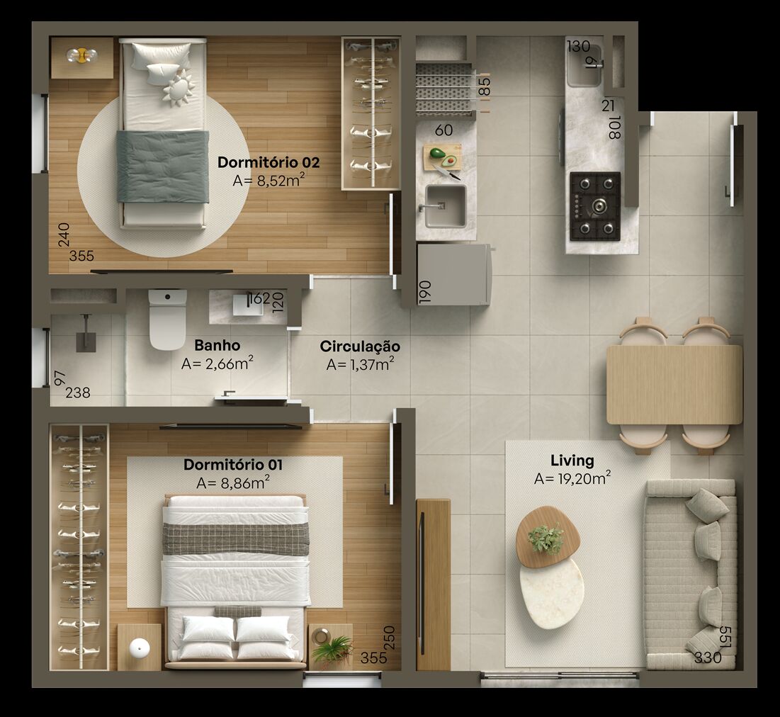 A planta de 47m² do Aura Residence é ideal para quem busca praticidade, funcionalidade e um excelente custo-benefício.